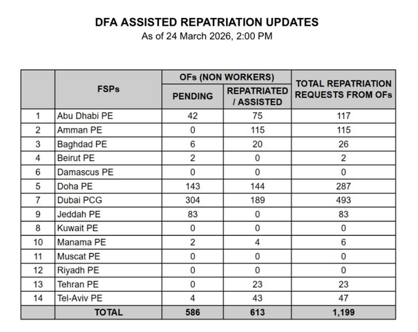 Updates on the repatriation of overseas Filipinos in the Middle East The Department of Foreign Affairs has received around 1,200 repatriation requests from overseas Filipinos in various countries in the Middle East as of 2 pm on Wednesday, March 24. Consisting of non-working Filipinos, 613 have been repatriated and/or assisted, while 586 requests are still pending. Most requests came from Dubai and Doha, Qatar. See photo for the full list: