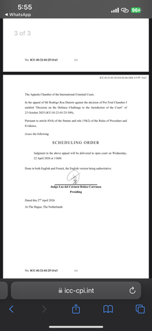 On this day, the appeals chamber will rule on the jurisidiction issue. If Duterte loses this again, that’s it for this aspect. Jurisdiction is their biggest argument but they have so far lost their motions. If the appeal is lost, that becomes final.