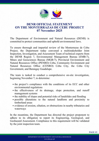 The Department of Environment and Natural Resources’ Central Visayas office together with the Cebu City government is conducting an investigation into possible environmental violations committed in the Monterrazas de Cebu project. This comes after Cebu City experiences massive floods due to Typhoon Tino.