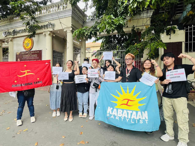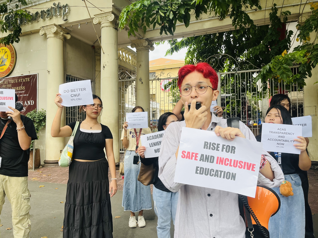 Cebu Normal University students protest today, October 21, during the Board of Regents (BOR) meeting to demand transparency and accountability after the Academic Center for Arts and Sciences (ACAS) building was damaged and left visibly leaning by the recent earthquake, forcing all classes online while the P2-billion Smart Campus project remains unfinished. | via Marjuice Destinado/Rappler