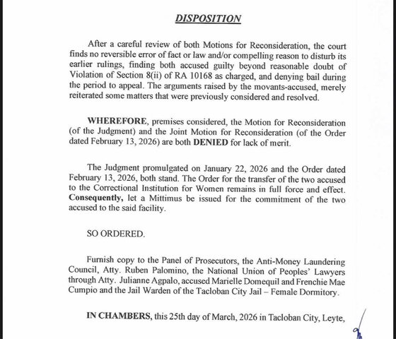 In a March 25 order, Judge Georgina Uy Perez of the Tacloban Regional Trial Court Branch 45 denies Frenchie Mae Cumpio and Marielle Domequil's motions for reconsideration, in which they appealed their terror financing conviction and the court's denial of their bail plea.
