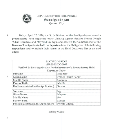 LOOK: The precautionary hold departure order against Senator Chiz Escudero and his business associate, Maynard Ngu, which bar them from traveling overseas.